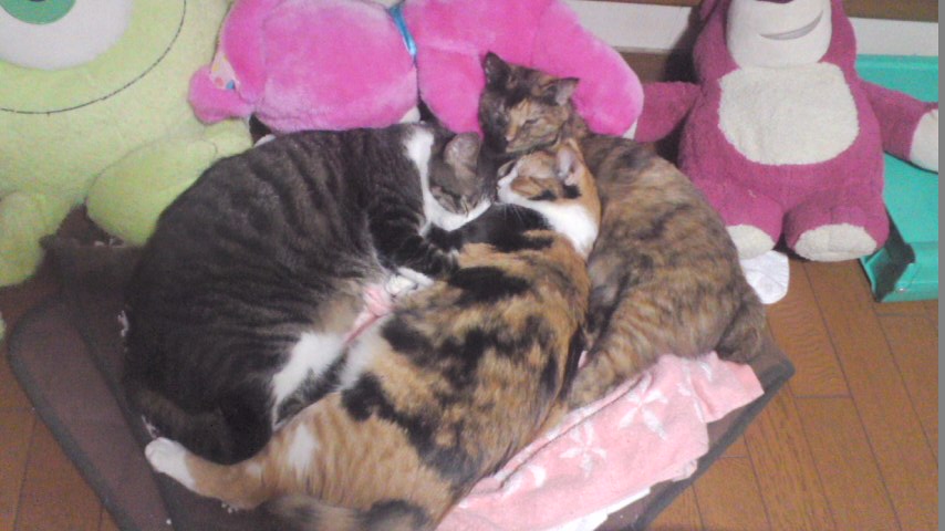 くーちゃん(サビ)が枕にされているような気がするが気にしないらしい。